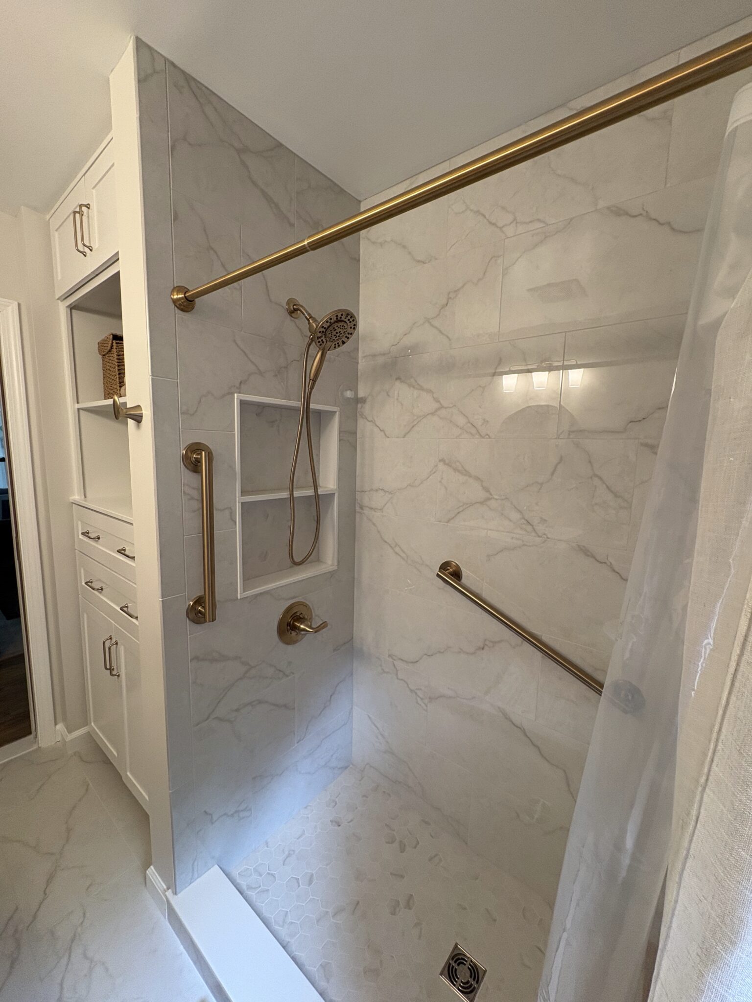 Bathroom remodeling projects featuring custom showers, tile installations, vanities, and modern layouts.
