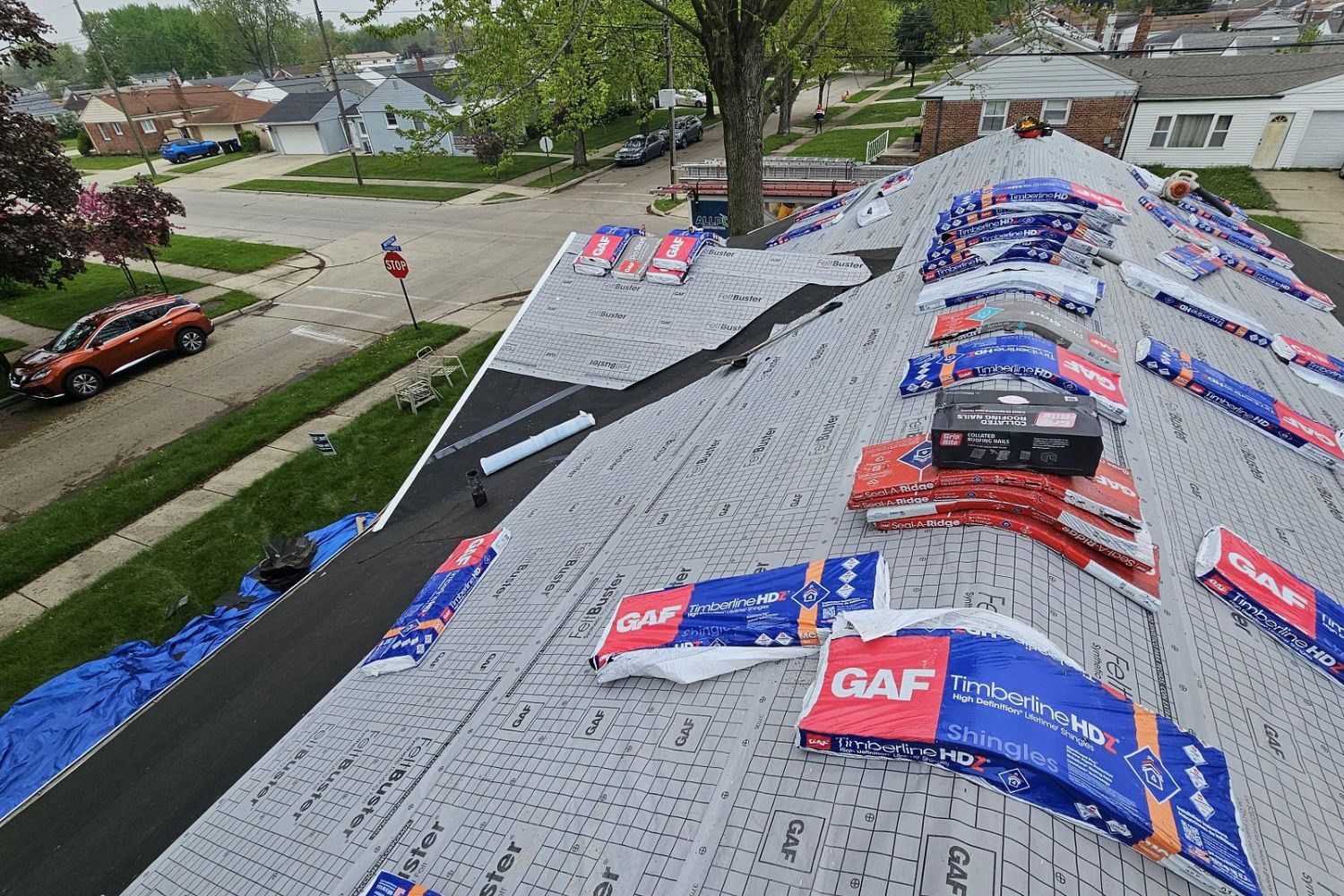Cover landscaping and position a dumpster close to the home. Shingles, nails, and debris fall fast and unpredictably.